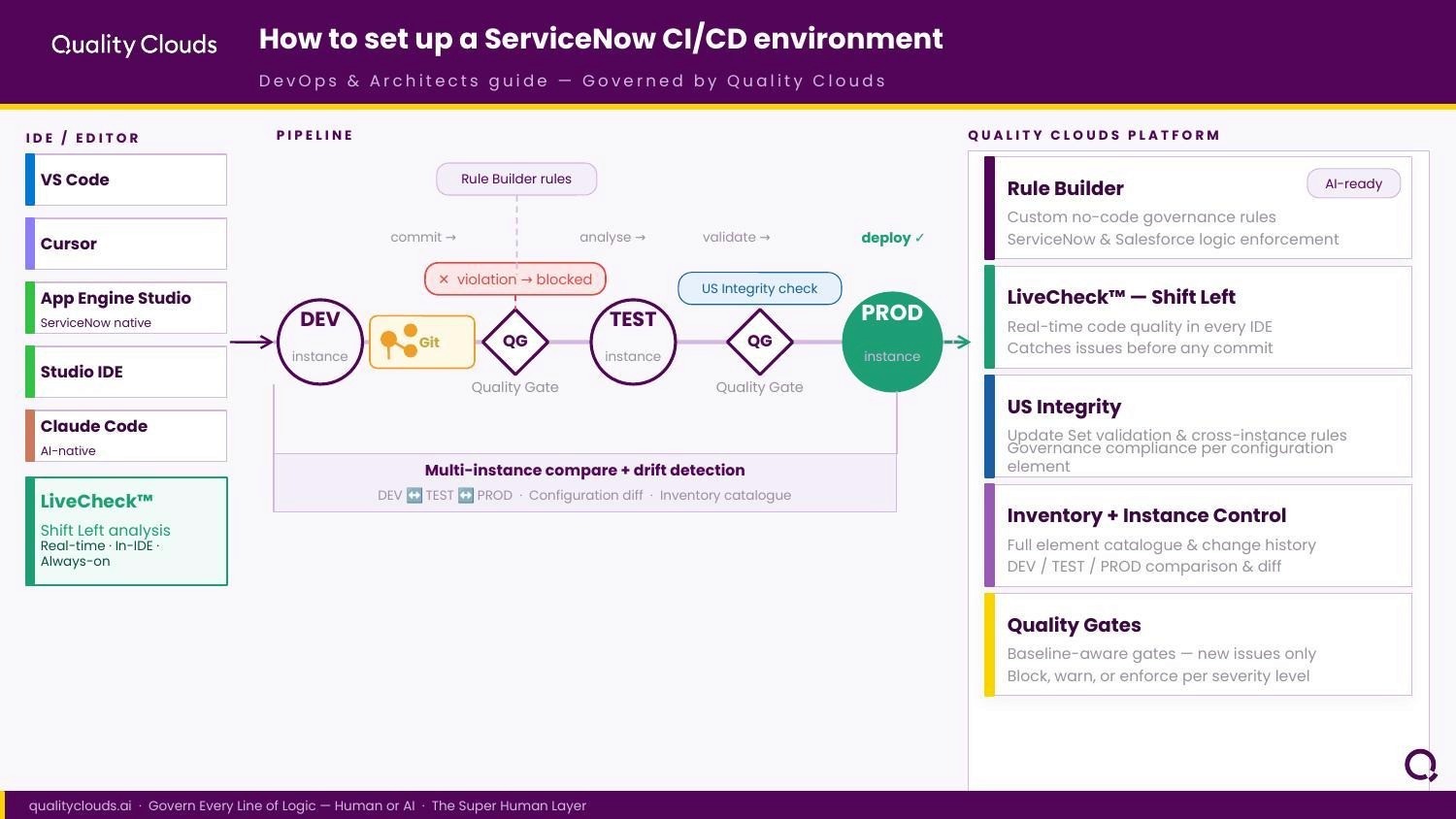 Whether a developer works in ServiceNow Studio, the ServiceNow SDK (pro-code native, VS Code in the web), Local VS Code with SN Utils, or AI-native environments like Claude Code and Cursor, the environment should be quality-aware. Quality Clouds Livecheck integrates across all of them.